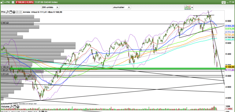 Une seconde jambe baissière est donc en train de se former. on retrouve un support dans la zone des 8400-8500 sur le nasdaq mais en dessous de cela, il faudra s’attendre à un retracement complet et retour vers les plus bas et certainement 8000 points sur le nasdaq. pour le CAC 40 c’est déjà fait et on parlera déjà des 5150-5110 voire des 5000-4910 si le Nasdaq doit aller chercher les 8000.