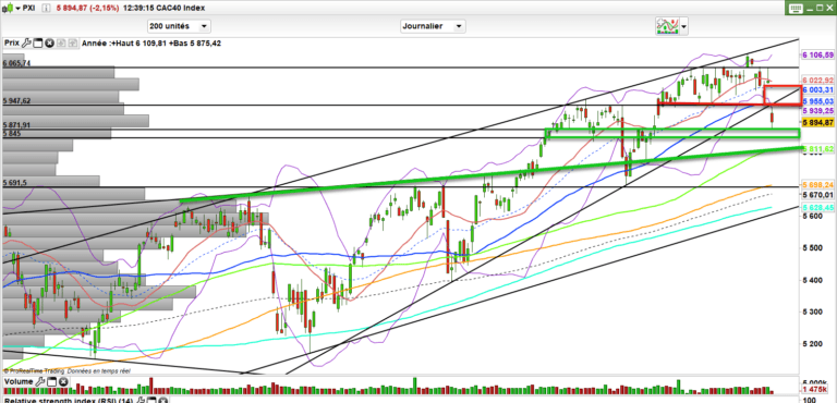 Ce que le marché nous dit c’est que 5950-5960 est maintenant résistance. Qu’en dessous, on neutralise la tendance à moyen terme et qu’on est en recherche de soutiens comme 5870 pour commencer à tenter le rebond. Comme d’habitude, c’est la force de ce rebond qui va nous indiquer la suite. un rebond technique pourra se mettre en place pour éventuellement permettre de sortir sur rebond de dossiers s’étant dégradés.