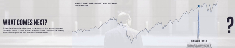 Voici une infographie présentant les constructions des plus hauts grattes ciel au travers de l’histoire comparée à l’évolution des marchés boursiers.