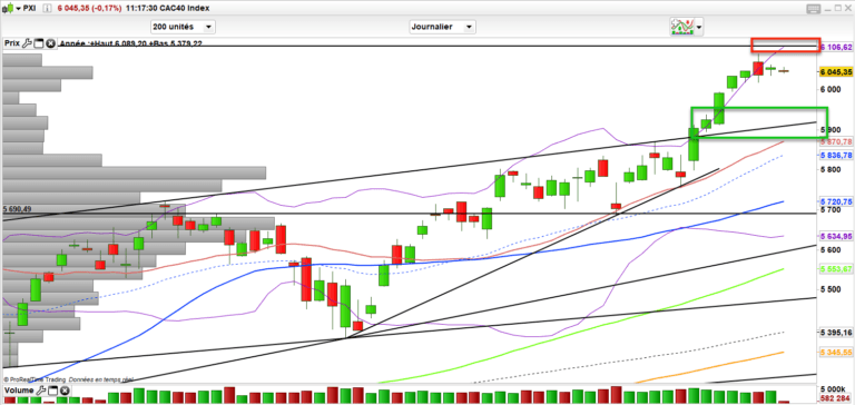 Niveau CAC 40, ras, c’est haussier point barre. Petite consolidation à plat sous la zone des 6100 points en résistance. zone des 5900 en support. au milieu ras, conso à plat, en mode attente. Sous les 6000, on aurait une volonté de consolider, et tous les experts vous diront oh mon dieu on a lâché 6000 points. C’est un niveau psychologique c’est pour ça mais techniquement le niveau important à court terme c’est la zone des 5900-5950 points. Au-dessus, tout baise sera à voir comme reprise de souffle saine tant qu’on conserve ces niveaux et je pousserai même le niveau à 5870.