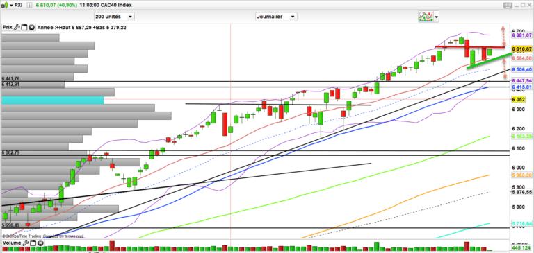 Sinon rien de méchant au-dessus des 6520 sinon 6400 à moyen terme. Reprise de souffle saine à ce stade et pas à l’abri de relancer la hausse donc en commençant par franchir 6640 points. Mais là le bouquet final commencerait de plus en plus à être tendu, ce qui ne ferait que renforcer le risque de volatilité sur un prorata.