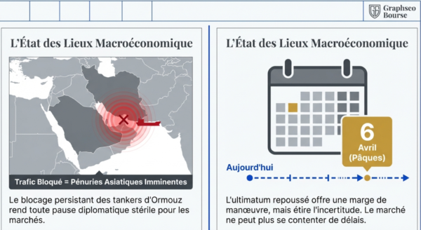 - La fermeture du détroit d’Ormuz provoque un choc énergétique majeur, avec une hausse des prix du brut de +43 % et des conséquences sur le commerce mondial.