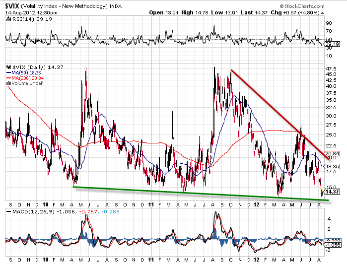 Egalement je vous invite à jeter un oeil du côté du VIX, l’indice de la peur, il n’a jamais été aussi bas et la dernière fois, c’était au début de l’année…et en été 2011. celui-ci avec un support oblique descendant, laisse apparaître encore un peu de marge à la hausse pour les indices boursiers  mais ensuite ???