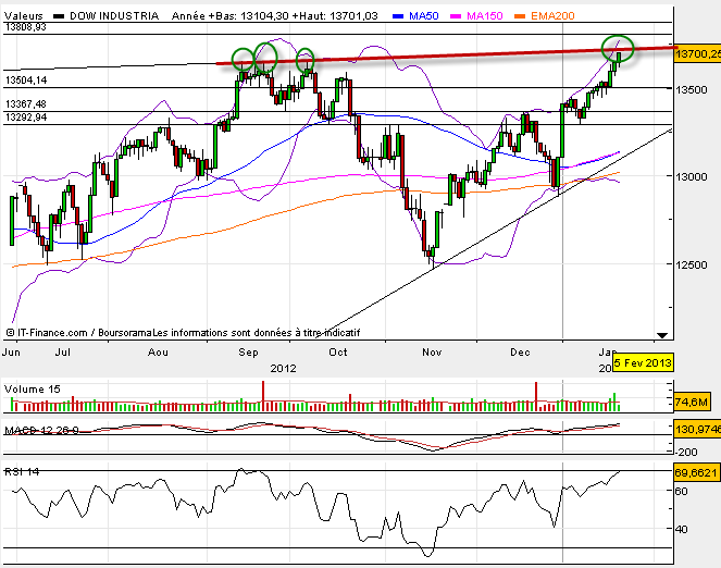 Ils sont sacrements forts ces américains. Ils viennent d’aller chercher un plus haut en séance, juste histoire que les médias nous le rabâchent tout demain. Par contre ils sont également aller chercher une ancienne oblique résistance qui avait lancée la précédente correction baissière. Alors bis repetita ? ou euphorie haussière ? Bon promis, si cette résistance lâche, j’arrête de dire que ça va baisser ;-)