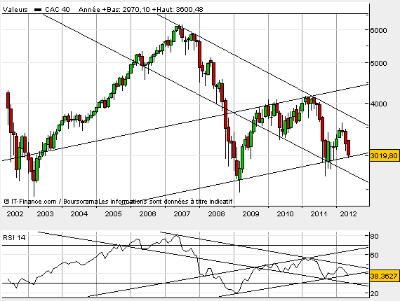 Au vue de ce graphique ci dessous et si nous prenons en considération le post de Julien intitulé » est ce le moment d’acheter des actions », la réponse est oui. Nous sommes d’une part dans une zone graphique où le soutien est très fort( cette zone est de plus confirmée sur le RSI), d’autre part ( post de Julien) nous sommes dans un moment d’extrême pessimisme ( élément contrariant par excellence). D’après le graphique nous avons un objectif de 3550pts environ, sous 1 à 2 mois