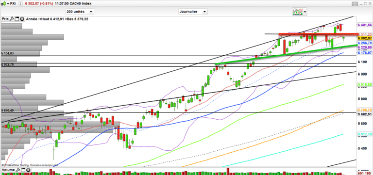Le niveau de dégradation pour moi se trouve sous les 6220 dorénavant. Et sous 6310-6320 on valide la mise en place d’un régime de consolidation. Faut s’attendre à du zig zag entre temps.Et à moyen terme à une construction plus de type range entre 6000-6500. Donc un marché plus pour trader que pour investisseur à mon sens pour ces prochaines semaines tout du moins.