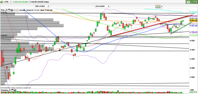 Au niveau du CAC 40, à court terme ras au-dessus des 4950-4980 avec 5000 en niveau psychologique. Il faudra s’affranchir des 5050 pour ouvrir la voie des 5100 points.