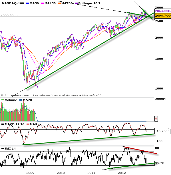 Le support majeur se trouve dans la zone 2650-2665 points. Ce qui recoupe avec le support d’un triangle sur le rsi et un trend haussier sur la MACD. Tant que les cours ou les indicateurs ne sont pas en dessous des repères énumérés, on reste à l’achat à long terme.