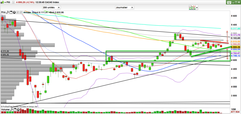 Graphiquement parlant, le cac 40 reste coincé avec une zone de support 4850-4890. et une zone de résistance 4960-5010 points. Il faudra donc sortir pour lancer la suite.