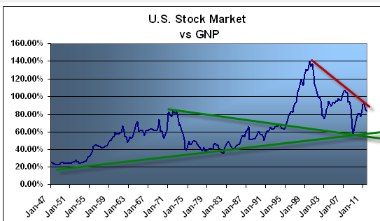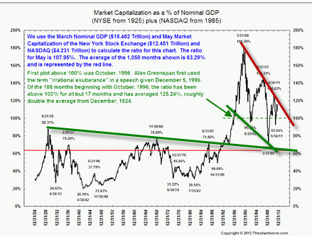 Si vous êtes un investisseur long terme à la Warren buffet cet indicateur que le plus riche des investisseurs utilise lui même devrait vous intéresser. En effet il s’agit de faire le ratio entre la capitalisation boursière de l’indice boursier américain et le produit intérieur brut du pays. Ainsi lorsque le taux est entre 70 et 80% vous êtes dans une zone d’achat long terme, dès que vous dépassez les 120 à 140% vous êtes en surachat et vous jouez avec le feu. Si les actions ne semblent pas peu chères avec cet indicateur, elles ne sont pas chères pour autant…