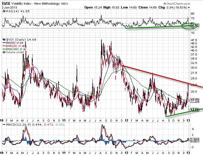 C’est une bonne question, puisque je me la pose moi-même régulièrement. Certains ne juraient que par le VIX voilà encore quelques mois au plus fort de la crise financière et de l’euro. Mais maintenant, après un certain retour au calme, l’indice de volatilité des marchés, la mesure de la peur, ne semble plus donner d’aussi bons signaux qu’avant. Toujours est-il, que l’analyse graphique lui est toujours applicable. Et si pour du trading court terme voir du swing trading, il est vrai qu’il ne serait être un indicateur primordial il permet néanmoins à long terme de pouvoir jauger d’une tendance ou tout du moins de sa durabilité.  Tout comme je peux être optimiste sur l’évolution des indices boursiers de manière positive jusqu’en avril 2013, je peux utiliser une analyse du VIX pour apporter un peu d’eau à mon moulin.