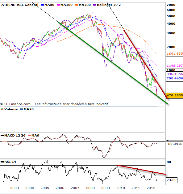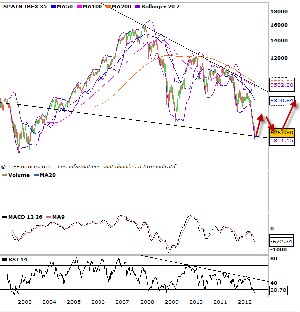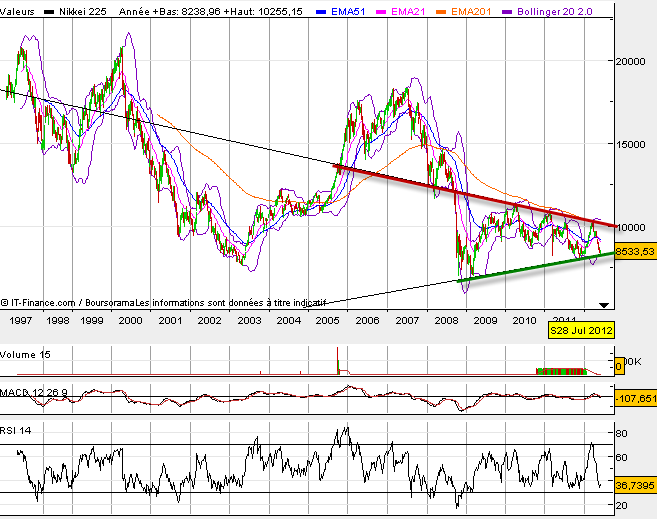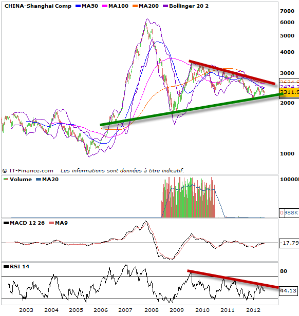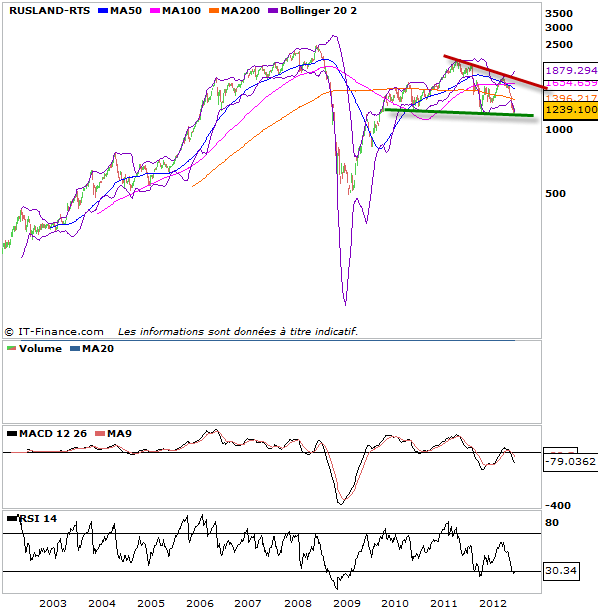 Si on fait un tour du côté des indices boursiers qui ont le plus souffert dernièrement et qui se retrouve aujourd’hui sur des points bas souvent jamais atteints voir il y a dix ans. on se rend compte que l’on assiste à des figures de congestion, que ce soit en biseau ou en triangle symétrique qui pourraient donc offrir une cassure à la hausse et un énorme rallye haussier. cela évidemment si l’on croit à un scénario du pire est derrière nous. Ces figures sont en graphique hebdomadaire, leur cassure offrira à n’en point douter la prochaine grande tendance des prochains mois. A la vue de la baisse, je me dis que l’on ne peut que remonter et les nouvelles ne peuvent être que meilleures. Suivez donc bien les indices faibles dans ces prochaines semaines. ils pourraient bien détenir la clé d’un nouveau cycle haussier long terme (3 à 6 mois)