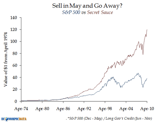 Voici un autre graphique qui se propose de répondre à la question. un investisseur qui détiendrait des actions de novembre à avril puis vendrait en mai pour acheter des obligations d’états avant de les vendre pour racheter des actions en octobre aurait très largement battu l’indice boursier américain et donc la performance d’un investisseur ayant investi à long terme toute l’année sur seulement les actions.