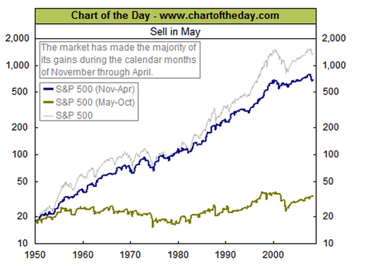 Sell in may and go away. Voilà un dicton boursier qui a la dent dure. Concrètement cela veut dire qu’il faut vendre chaque année ses actions en mai puis ne plus allumer le pc avant octobre. Il s’agit certes d’un mythe car il est tout à fait possible d’avoir des tendances haussières pendant l’été, la preuve en est cette année. Mais si ce mythe existe c’est parce qu’en regardant les statistiques depuis que la bourse existe aux USA et bien force est de constater qu’en effet un investisseur ayant décidé chaque année de vendre ses actions en mai avant de les racheter en octobre aurait nettement plus gagné en bourse que l’investisseur ayant conservé tout au long de l’année ses actions.