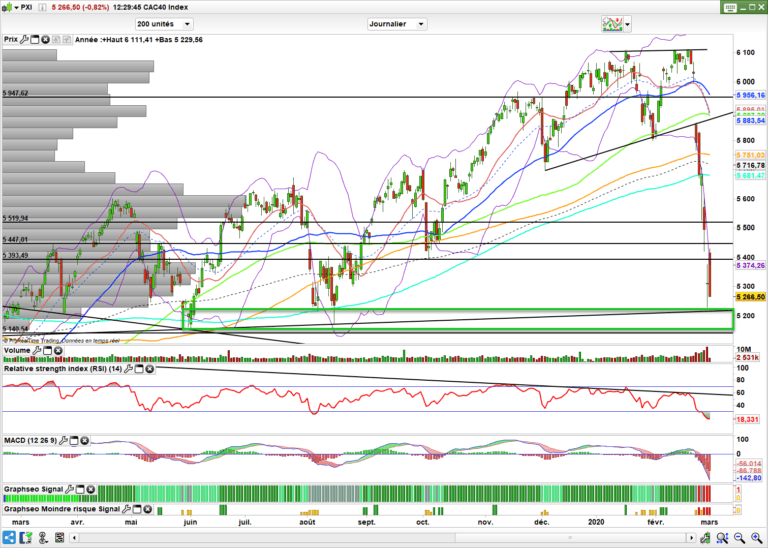 Au niveau du cac 40 donc, sous 5420 les vendeurs gardent la main. A très court terme, on doit maintenant bataille pour sauvegarder des soutiens et construire une congestion, dont l’issue permettra d’entrevoir la suite. Il faut donc se montrer patient et voir comme l’on va construire tout en restant prudent, car sous les 5220, le CAC 40 aurait sans doute envie d’aller faire un tour du côté des 5150. Cependant je pense que le marché a bien anticipé maintenant le scénario du pire et de la dégradation du corona. On va donc naviguer à vue pendant quelques jours le temps d’avoir de nouvelles choses à se mettre sous la dent. Il faudra revenir au-dessus des 5290, pour relancer l’idée d’un rebond. En dessous, on navigue à vue