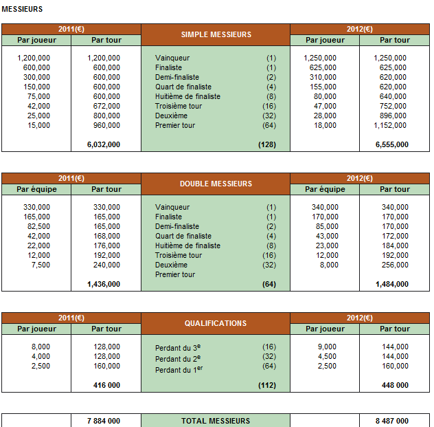 Roland Garros cela commence dimanche prochain et chaque année c’est l’occasion de retrouver les meilleurs joueurs et joueuses de tennis et l’occasion pour nous de voir combien gagneront les vainqueurs de Roland Garros en 2012. Première observation, les dotations augmentent d’année en année et cela ne suit pas l’inflation :-).