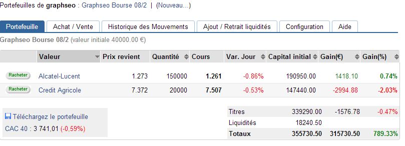 Rien de neuf. Je continue de croire en une consolidation nécessaire à court terme. J’ai loupé le creux de début de matinée, du coup j’ai conservé le solde. L’indicateur Allemand a permis une belle remontée mais graphiquement, le mal semble fait. Du coup je conserve mes positions en Vente à découvert, n’attendant plus que Monsieur Marché cette conviction qui est la mienne. Par contre je réitère mes propos, si en effet, une consolidation me semble nécessaire je ne crois pas en une reprise baissière avant avril 2013. Pour moi cette consolidation sera l’occasion de renforcer des positions à l’achat en temps voulu afin de profiter d’un second effet kiss cool haussier. Maintenant la fin du mois SRD est pour bientôt, et comme je l’ai souvent vu, un vrai signal ne se déclenche que l’arrivée de l’échéance.
