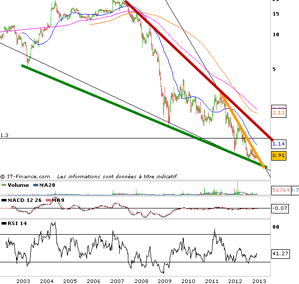 Voici une vue de l’action Partouche en données hebdomadaires pour voir que la tendance baissière de long terme se déroule dans un biseau descendant. Tant que ce biseau descendant prévaut, la tendance demeure baissière. Cependant, à l’intérieur de ce biseau, on en retrouve un autre, en modifiant le dernier trend baissier, plus pentu que le précédent. Ce qui nous donne une action Partocuhe, proche de déborder sa résistance et de donner un signal d’achat qui serait à interpréter comme signal de rebond. Ce rebond aurait comme objectif la partie haute du biseau descendant. A suivre.