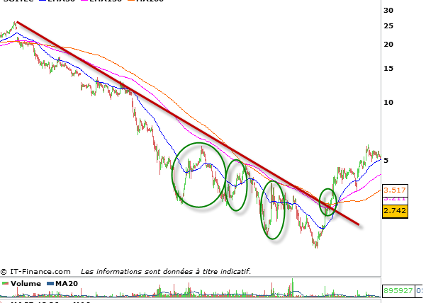 Du point de vue de l’investisseur, cette action fut un mauvais investissement pendant des années matérialisé par le trend baissier et l’évolution sous la droite en rouge. Seulement au croisement des cours et à la cassure de la tendance baisisère en rouge cette action est redevenue un bon investissement.