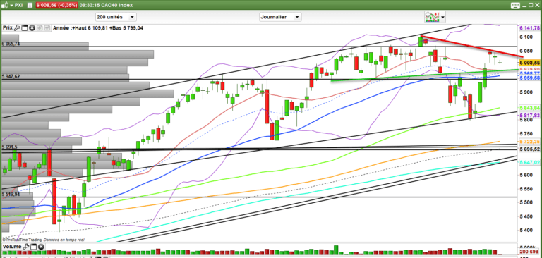 Les médias continuent à faire du divertissement plus que de l’information. Mais la vérité est dans les marchés. Et les marchés sont en train de temporiser voire d’incuber en attendant la suite. On a donc droit à une consolidation en attendant, coincée entre les 5950-5980 en support et 6030-6065 points. Entre donc à très court terme c’est neutre. Mais à court, moyen et long terme, c’est haussier point barre