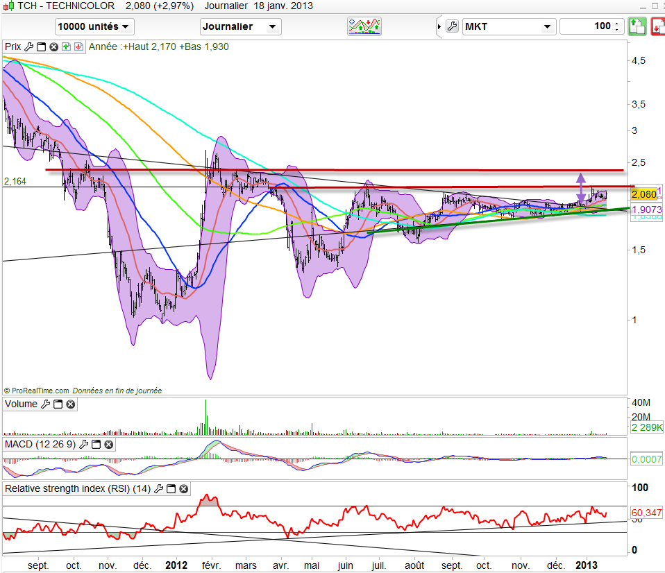 Prenons donc un exemple avec Technicolor qui comme vous le savez est une action à laquelle je crois beaucoup. Prenons un horizon de placement long terme et donc une utilisation du graphique en données quotidiennes.
