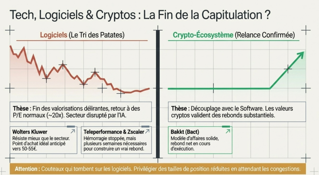 - Capitulation sur le Software (VS) Rebond des Cryptos : Alors que des titres liés aux actifs numériques comme Bakkt valident des rebonds substantiels et des sorties de biseau, le secteur logiciel subit un « nettoyage » brutal. Des dossiers comme Zscaler ou Reply sont en pleine phase de capitulation finale, l’IA venant « casser » les modèles établis de cybersécurité.