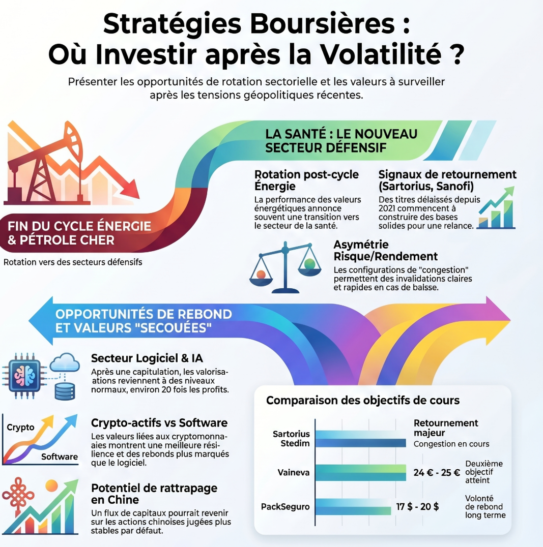 Nous quittons la phase d’hémorragie pour entrer dans une période de congestion et de construction qui devrait nous porter jusqu’à l’été. Ce n’est pas le moment de chasser les prix, mais de construire des lignes sur des niveaux de support historiques. Le marché redéfinit ses prix « normaux » face à l’IA et aux tensions mondiales. La rotation vers la Santé et les valeurs de retournement asymétriques est le thème central de cette fin de trimestre.