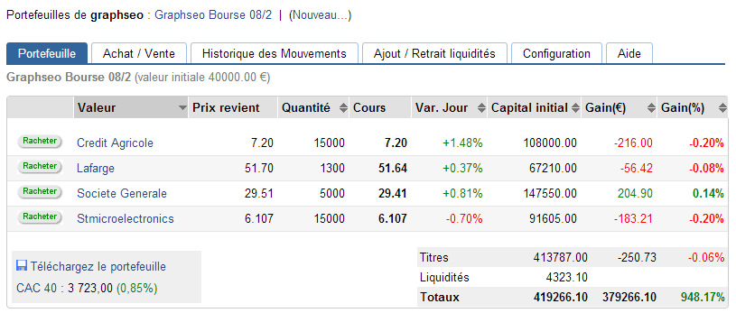 Voilà, j’ai décidé de suivre mes convictions et sur la fin de séance de passer en vente à découvert sur l’ensemble de mon portefeuille. Je suivais les bancaires depuis un moment. c’est à double tranchant bien sûr. Car elles seront à la hausse ou à la baisse, sur le devant de la scène ces prochains jours. En effet, soit la crise de l’euro redevient un sujet à la mode, et la peur revient sur le marché donnant lieu à des dégagements en premier lieu sur les bancaires, soit la BCE et la FEd continuent de tout faire pour garder ce marché fébrile en course pour sa hausse parabolique et là les bancaires seront de la partie mais à la hausse.