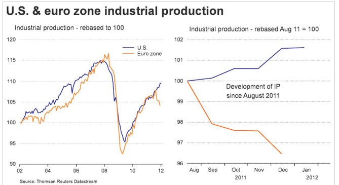 Les statistiques tombent et on voit clairement maintenant que les Etats-Unis sont entrain de se sortir de la crise alors que l’Europe s’y enlise. Les Us ont décidé de continuer d’imprimer des billets, et de financer l’économie en augmentant leurs déficits et ayant en plan de les réduire en augmentant les taxes une fois l’économie auto alimenté alors que l’Europe elle a choisie la voie de l’austérité pour réduire les déficit dans une économie en récession.