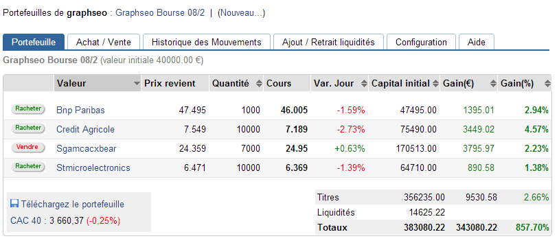 J’ai conservé les positions en vente à découvert. j’ai pensé racheter à la clôture mais finalement je conserve en overweekend. Premièrement, car je doute qu’une quelconque nouvelle vienne donne run élan haussier en ouverture lundi matin et deuxièmement parce que les US semblent entrain de mettre en place leur figure de top de marché. Et enfin troisièmement, car aucune signal n’indique de racheter ses positions, car les signaux restent à la vente pour les titres en portefeuille et pour le cac 40. j’ai donc pris la décision de conserver les positions en overweekend pour le début de semaine prochaine.