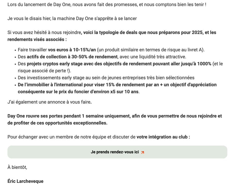Eric Larcheveque va plus loin avec un email envoyé pour promettre des deals dans des entreprises, de l’immobilier, des investissements dans l’art, des projets cryptos avec des rendements garantis…oui oui…de 10-15% par an…