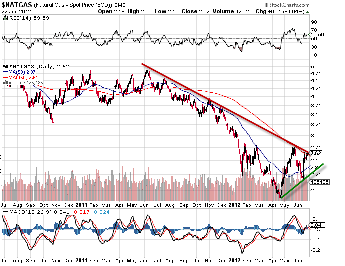 Voilà quelques jours je vous proposais de suivre la hausse du gaz naturel et la formation d’une figure de retournement de la tendance. celle-ci franchie une nouvelle étape actuellement, il ne manque plus que le passage et la cassure du trend baissier en rouge pour valider le retournement effectif durable de la tendance. On devrait rapidement rallier les 3,25 dollars.