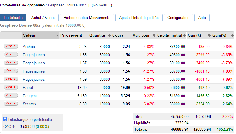 J’ai donc repris du Peugeot, du Stentys, Parrot et Archos. Pour la plupart des trades, je suis déjà en trade confortable, ce qui va me permettre de laisser courir la position en ne risquant qu’une très faible perte des frais puisque le stop mental sera placé sur le prix d’achat. Stop mental en période volatile surtout sur des petites ou moyennes capitalisations et encore plus dans un marché comme celui-ci.