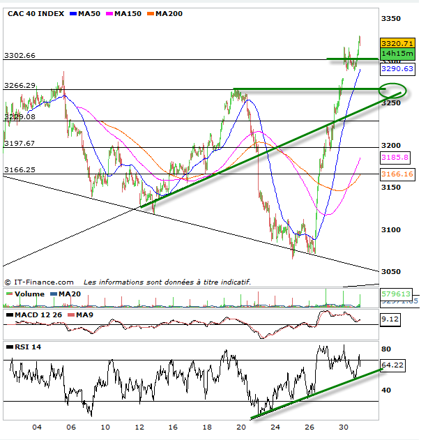 La tendance est donc haussière ce soir et ce au-dessus des 3267 points. même si sous 3300 points on se protégera. la zone 3267-3300 sera donc une zone d’attente.