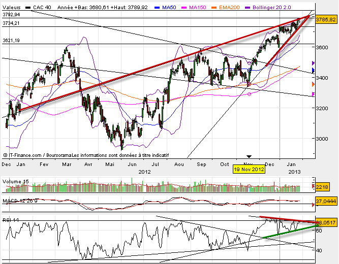 Ce qui est clair, c’est que la parabolique haussière démontrée ce weekend ne pourra pas durer éternellement. Ce qui est encore plus sur, c’est qu’elle continue de durer. Donc pour celles et ceux qui tradent le cac 40, pas d’anticipation tant que 3763 tient. Par contre, comme on peut le constater, certaines actions ont déjà donné, elles, leurs signaux de consolidation. ACA, ALU, SANOFI, STM et d’autres que je n’ai pas eu le temps d’analyser. Pour moi donc, le cac 40 aura du mal à poursuivre très longtemps.