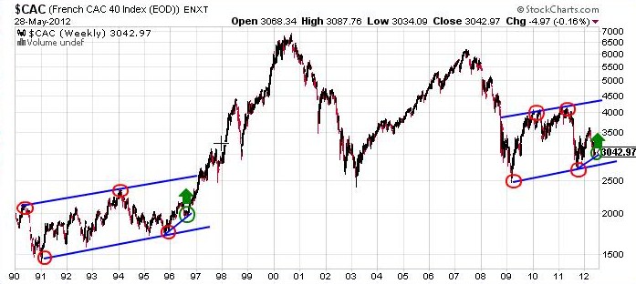A ce moment là je me dis: » bon, ok, si analogie il y a sur le dollar entre la période actuelle et celle de 91 à 96, et bien voyons ce que cela donne sur le cac 40″.