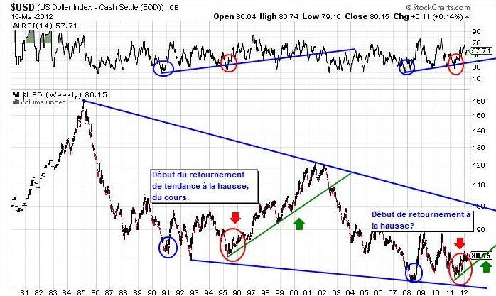 L’autre jour donc, en quête d’un sens à donné au marché depuis 2009, n’y arrivant toujours pas comme d’habitude dans cet océan de volatilité, j’ai relu et suis tombé fortuitement sur un texte d’une de mes analyses sur le dollar qui disait ceci: « L’analogie entre la période actuelle ( depuis 2008) et celle du début des années 90 (de 91 à 96 ), est pour le moins saisissante, analogie graphique qui semble être confirmée ,par l’analogie sur le RSI avec la mise en place d’un trend haussier long terme. »
