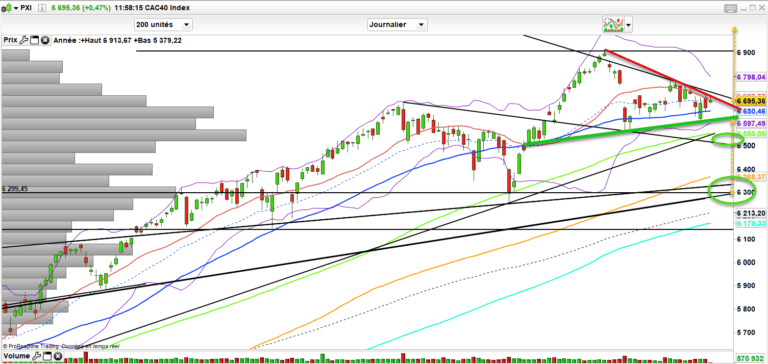 ras sur le cac, on continue d’arriver au bout de la congestion de court terme. Franchir les 6730-6750 permettrait aux acheteurs de reprendre la main et tenter la relance. Sous 6666 et 6000, de relancer la correction vers la zone des 6500-6570. Neutre donc en mode dégradé toujours. on fera attention notamment aux petites capitalisations dont les carnets peuvent se creuser rapidement si le marché décide de prendre la tangente.