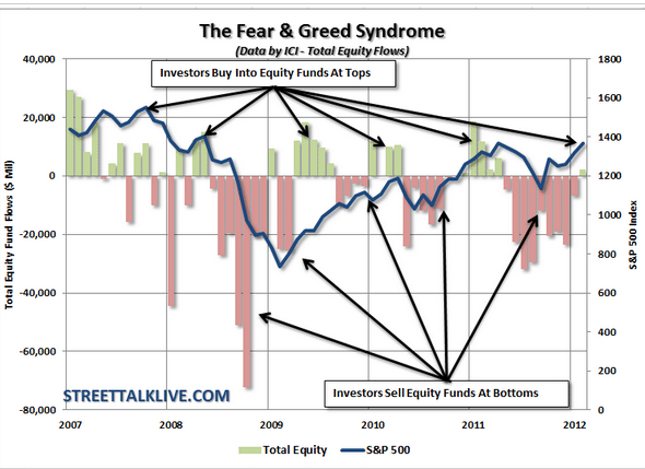 C’est quand la bourse commence à devenir populaire auprès des médias, que l’on voit une masse de particuliers se jeter sur les fonds et les actions. Pourtant d’après le graphique ci-dessous on peut voir que dans la majorité des cas, lorsque les médias et donc les particuliers achètent, c’est que l’essentiel de la hausse des marchés boursiers est derrière nous et que l’on approche d’un top.