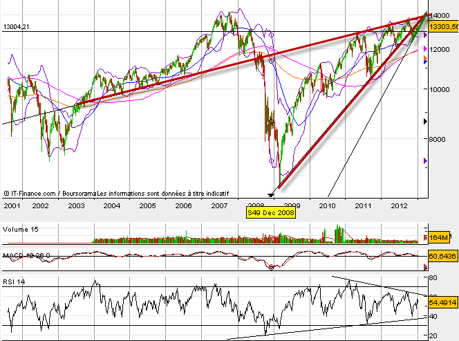 Alors que la fin 2012 et le début 2013 furent des périodes très haussières pour les marchés, et que les médias commencent maintenant à parler de la bourse, alors même que les statistiques de graphseo bourse explosent grâce à la recherche de mots clés comme : comment gagner rapidement et facilement en bourse, je commence sérieusement à remettre mon optimisme en doute pour 2013. Bien entendu, vouss avez déjà que j’émettais des réserves quand à la poursuite de la hausse. Mais là c’est tout autre chose. Je déteste lorsque le consensus est dans le même sens que moi. Ou tout du moins avec le même timing. Du coup j’émet des réserves quant à mon objectivité et je reprend mes graphiques. Car si en effet, lorsqu’on regarde le graphique du CAC 40 rien ne laisse supposer, une fin malheureuse pour l’indice de la bourse de paris en 2013 car la tendance haussière est solidement installée, il en est tout autrement lorsqu’on regarde le graphique du dow jones.