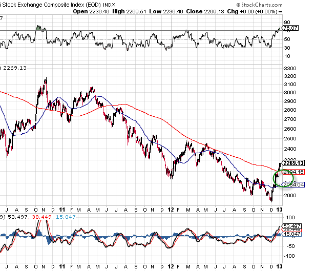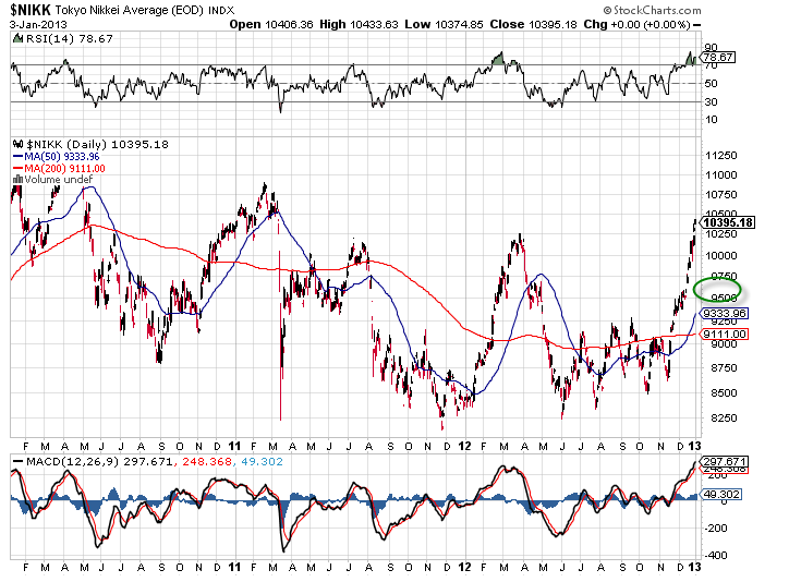 Cela fait maintenant plus d’un mois que je vous ai proposé de suivre les marchés chinois avec le shanghai composite et le marché japonais avec le Nikkei en vous disant que résidait là, dans ces deux marchés, un très fort potentiel de diversification et de performance pour les portefeuilles boursiers sur le long terme avec le renouveau engagé de ces deux marchés, il semble donc maintenant établi qu’il faudra compter sur ces deux marchés en 2013 pour apporter un surplus de performance. Bien entendu, il conviendra d’attendre une consolidation dorénavant, pour celles et ceux qui ne sont pas encore placés. Et vous que pensez-vous de ces marchés ?