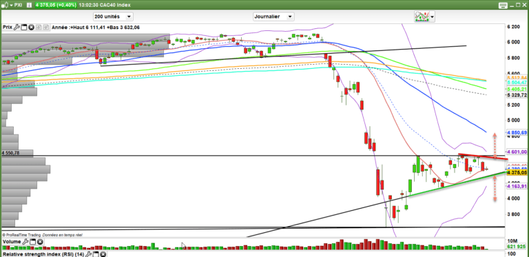 Malgré tout on a quelques beaux rebonds qui se mettent en place sur Airbus, crédit agricole, Technip etc. Donc ça tient pas trop mal à ce stade mais il reste encore du boulot, donc en ligne avec la construction du CAC actuelle où l’on attend le verdict.
