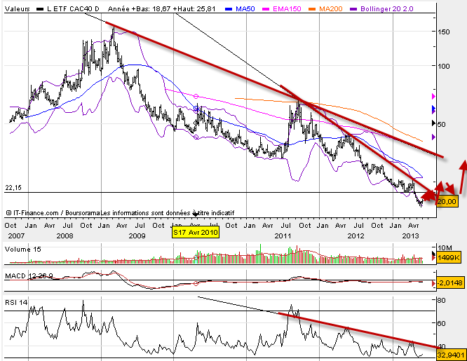 Après l’or qui est entrain de former une figure de rebond que j’avais pu vous montrer la semaine dernière, je tiens ce soir à mettre un focus sur le vix, l’indice de volatilité des marchés ou encore l’indice de la peur. Plus il monte et plus les marchés sont volatiles. Plus les marchés sont volatiles, et plus le risque de correction « soudaine » est fort. ce qui est intéressant ici, ce n’est pas le rebond qu’on pourrait voir sur le BX4 et donc sur le VIX, mais plutôt les implications sur la tendance long terme. En effet, certains y verront là le prémisse à la construction d’une tendance haussière de rebond fort sur le BX4 pour revenir chercher une oblique baissière long terme. Cela coïnciderait avec une correction des marchés et un retour sur les fondations de la tendance haussière de fond. Ainsi, les marchés pourraient, étape par étape construire une figure de top alors que le bx4 construit une figure de retournement. Le but serait un test de l’oblique de tendance de fond, du support majeur de cette tendance haussière que nous connaissons depuis une année. Si le VIX de plus se réveille, cette correction pourrait piquer. Plus que jamais il faudra être vigilant et faire attention aux overnight et overweekend, les gaps pouvant être méchants.