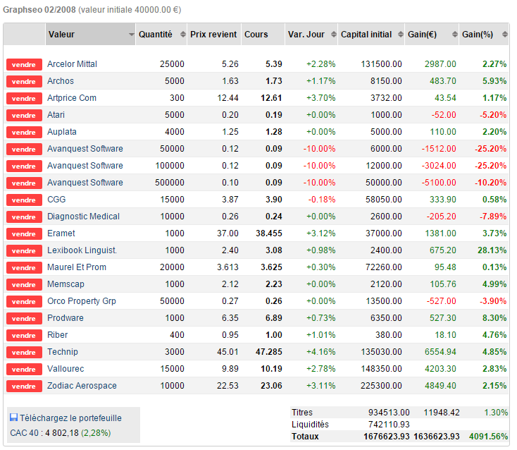 Cela fait plaisir de voir le marché prendre son envol, exactement comme on l’avait pressenti. Cela n’arrive pas souvent alors il faut savoir en profiter. Néanmoins le secteur pétrolier mise à part Technip n’a pas trop suivi le mouvement haussier généralisé, la faut à un pétrole qui corrige à nouveau. Je conserve les positions néanmoins. En fin de matinée j’avais pris position sur Zodiac devant la bonne tenue du support. J’ai également réussi à prendre position sur Arcelor. Je conserve, car les 4850 points devraient être visés et donc il reste pour moi une marge haussière pour demain, et une plus grande marge de manœuvre encore sur les pétrolières qui devraient vivement rebondir même si la hausse est un peu terne ce jour.
