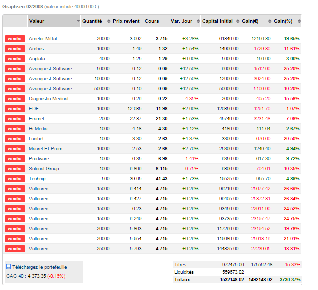 J’ai profité de la hausse du secteur minier et pétrolier pour réduire mon exposition. Mes convictions sont fortes sur le secteur mais la volatilité n’est pas gérable sur de si importantes positions pour mes nerfs. J’ai donc décidé de prendre mes profits sur Arcelor en vendant les trois quart de la positions à +19% de gains. Neopost je largue également tout avec +5%. J’ai largué La grosse position sur Vallourec prise avant hier en plusieurs fois et j’ai également vendu une grosse partie des Technip.