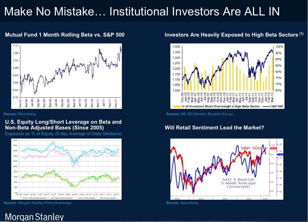 Alors que plusieurs analystes pensent qu’ils restent encore des cartouches à certains investisseurs qui permettraient de faire avancer les marchés encore plus, Morgan Stanley semble penser qu’au contraire les investisseurs institutionnels soit 98% des transactions sur le CAC 40 sont eux, All in.
