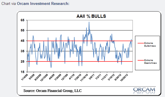 Les investisseurs sont actuellement très haussiers. Encore plus qu’en décembre alors même que le mois de décembre 2012 était le niveau le plus élevé de l’année. C’est ce que démontre le dernier rapport AAII qui évalue le sentiment haussier ou baissier des investisseurs particuliers. on parle donc là du sentiment des investisseurs comme vous et moi, donc une masse qui ne représente que très peu d’échanges. Mais c’est surtout un indicateur pour les contrarian qui disent bien souvent que lorsque la masse redevient acheteuse et haussière c’est que l’essentiel de la hausse est derrière nous. Il faut dire que les précédentes années leur ont donné raison. Les niveaux actuels, s’ils ne peuvent prévoir la fin de la hausse, peuvent en tout cas nous dire qu’il faudra être prudent prochainement car de tels sentiments haussiers élevés sont historiquement gage d’un environnement boursier sur les actions devenant plus dangereux et proche d’une correction… Maintenant, l’euphorie haussière, peut également tenir des mois, et cela même contre toute logique économique. Le marché a ses propres règles. Suivez votre stratégie, et évitez de trop anticiper.