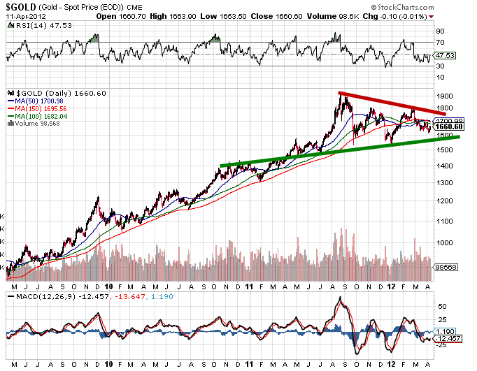 C’est la question que je me pose à la vue de la configuration graphique de l’or dans un triangle isocèle dont la sortie semble plutôt à privilégier vers le bas avec un premier objectif baissier sur les 1380-1400 dollars. Après une première consolidation, l’or s’est maintenant durablement installé sous ses moyennes mobiles et les acheteurs semblent bien en incapacité de pouvoir reprendre la main et ce malgré une inflation rampante et la survenue des nouveaux soucis de la dette en Espagne. Les causes de la hausse de l’or ces dernières années ne produisent pas les mêmes effets, ce pourquoi je serai très prudent quant à l’avenir des prix de l’or même si je l’ai toujours été, dans le passé à tort mais il me semble maintenant trop tard pour changer son fusil d’épaule. Attentions donc à une rupture baissière des 1600 dollars qui ouvrirait les portes à une baisse des prix de l’or plus importante en direction des 1380 dollars.