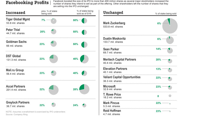 Demain c’est le grand jour de l’introduction en Bourse. Bien évidemment ce n’est pas le particulier lambda qui va en profiter. Au mieux le particulier lambda pourra acheter demain en ouverture des cotations. Alors que l’on parle déjà d’un prix de 60 fois les bénéfices, les particuliers ne pourront acheter donc qu’a un prix très certainement supérieur, tout du moins pour le premier jour de cotation, l’engouement devrait créer la spéculation autour du titre Facebook. Une introduction en bourse s’est donc surtout l’occasion pour les investisseurs institutionnels de faire leur beurre. Parmi eux, Zuckenberg bien entendu, mais d’autres grands noms comme Bono, avec sa société d’investissement Elevation. Du coup Bono avec l’introduction en bourse de Facebook demain, va devenir le plus riche rockeur de tous les temps, au dessus de la richesse de Paul McCartney. Bono avec Elevation avait acheté pour 90 million de dollars de parts de Facebook qui valent aujourd’hui, enfin demain vaudront 1,5 milliards. Sacrée plus value en 3 ans. Quand je vous disais que les gagnants d’une introduction en bourse sont surtout les institutionnels. Il restera des miettes pour les particuliers, encore faut-il que l’action monte avec une telle sur valorisation, on se souviendra de Pandora, Zynga ou encore Linkedin.