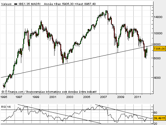 Juste un petit graphique où il semblerait que le rebond estival soit un simple pull back sur l’ancien support long terme de l’indice espagnol, cassé à la baisse en avril dernier. Cette vision des choses est je trouve un peu effrayante… Le RSI de son côté est certes proche de son oblique baissière de long terme et  de la survente, pour autant comme le fait souvent et justement remarquer Julien, le RSI peut rester longtemps en survente tout comme en surachat. Bref tous les regards sont plus que jamais braqués sur Super Mario pour détendre l’atmosphère.